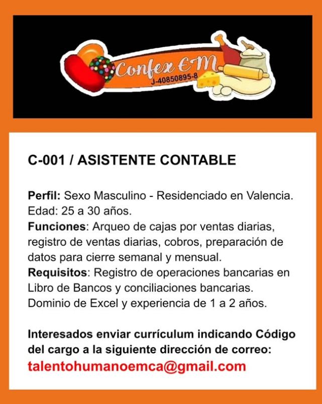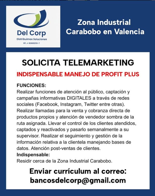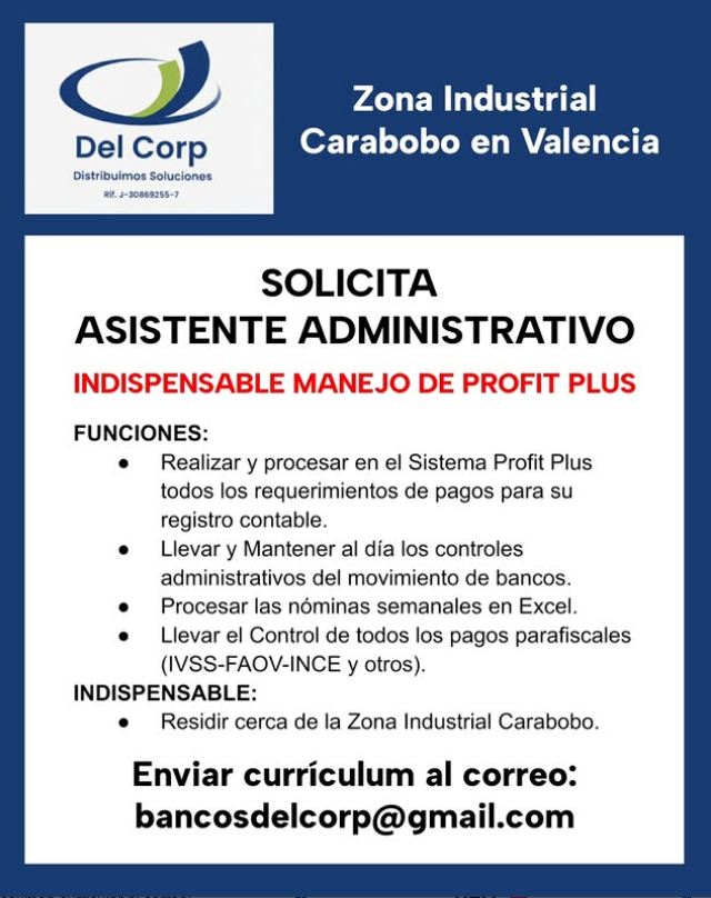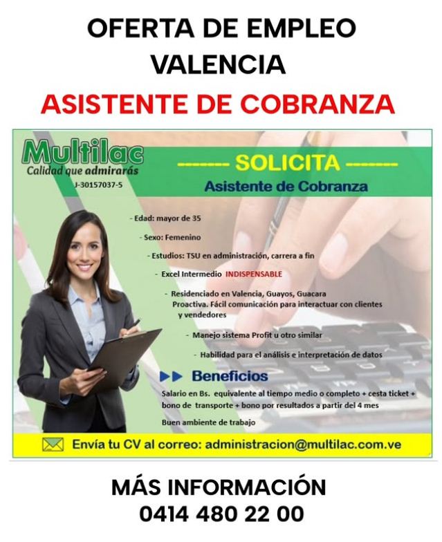 OFERTA DE EMPLEO. VALENCIA. MULTILAC Solicita ASISTENTE DE COBRANZA. Edad: mayor de 35. Sexo: Femenino. Estudios: TSU en administración, carrera a fin. Excel Intermedio INDISPENSABLE. Residenciado en Valencia, Guayos, Guacara. Proactiva. Fácil comunicación para interactuar con clientes y vendedores. Manejo sistema Profit u otro similar. Habilidad para el análisis e interpretación de datos. Beneficios: Salario en Bs. equivalente al tiempo medio o completo + cesta ticket + bono de transporte + bono por resultados a partir del 4 mes. Buen ambiente de trabajo. Envía tu CV al correo: administracion@multilac.com.ve