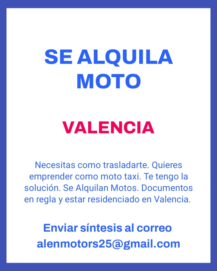 Necesitas como trasladarte. Quieres emprender como moto taxi. Te tengo la solución, Se Alquilan Motos. Documentos en regla y estar recidenciado en Valencia. Enviar síntesis al correo: Alenmotors25@gmail.com