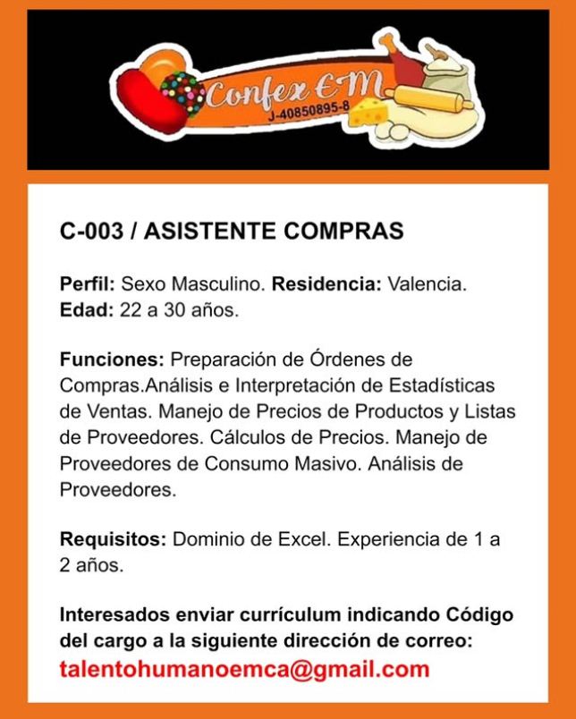 OFERTA DE EMPLEO. VALENCIA. Nos encontramos en la búsqueda de los siguientes perfiles: SUPERVISOR DE LOGÍSTICA, SEGURIDAD E INFRAESTRUCTURA + 40 años. ANALISTA DE COMERCIALIZACIÓN Y MERCADEO + 30 años. REGENTE FARMACÉUTICO + 40 años. SUPERVISOR DE ALMACÉN + 35 años. ALMACENISTAS + 25 años. FACTURACION + 25 años. PERSONAL DE VENTAS + 30 años. PERSONAL DE SEGURIDAD + 40 años. OPERARIOS DE MANTENIMIENTO + 35 años. Requisitos exigidos: Edades señaladas (Limitativo) Con residencia en el territorio Carabobo. Poseer grado de instrucción y formación acorde al cargo. Disponibilidad inmediata. Certificado Médico Sanitario vigente (Emitido por INSALUD) Experiencia comprobable en el cargo. Si cumples con todos los requisitos te invitamos a presentar tu postulación al siguiente correo: postulaciones.drog@gmail.com Debe indicar cargo al que se postula y grado de instrucción