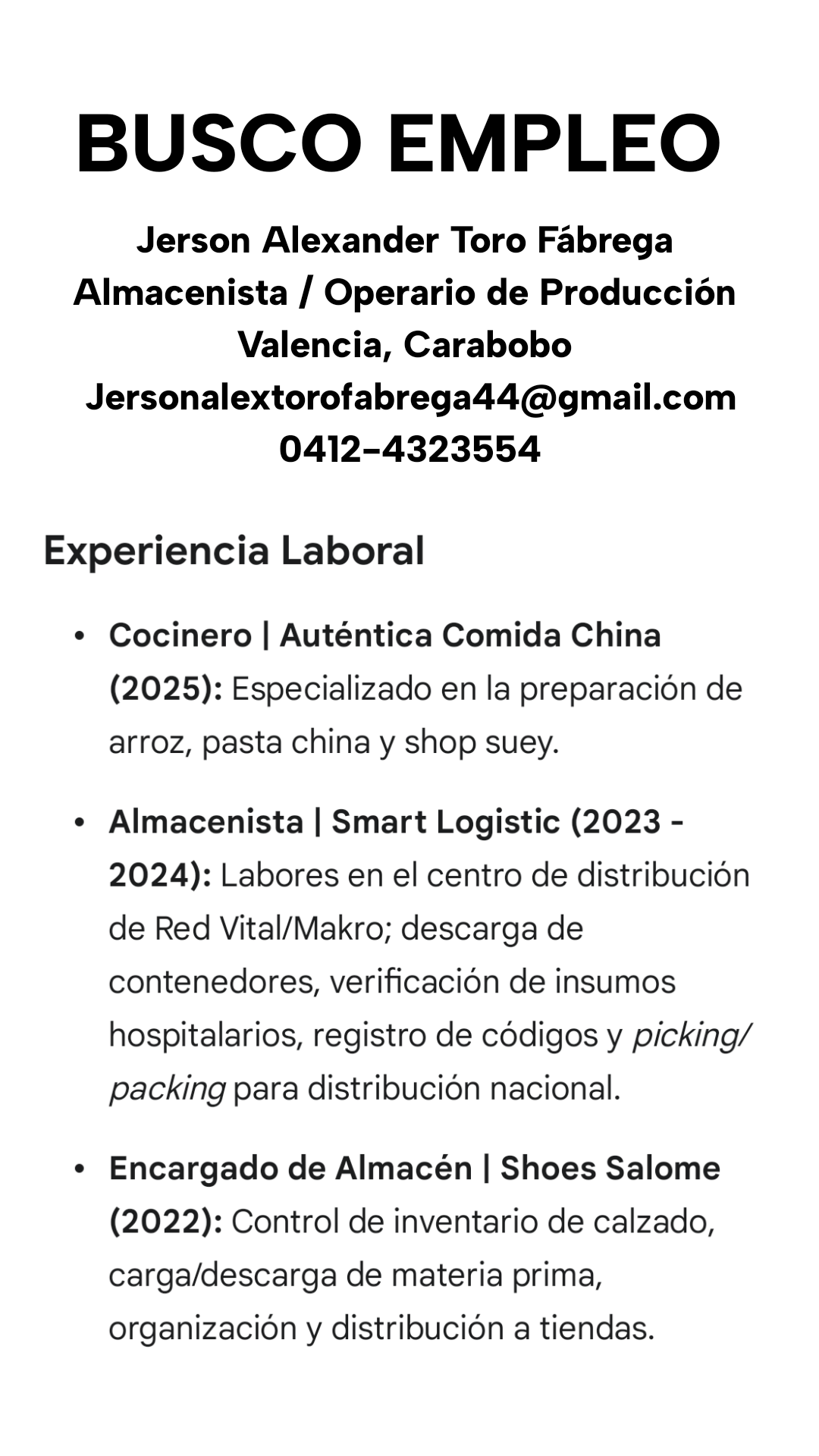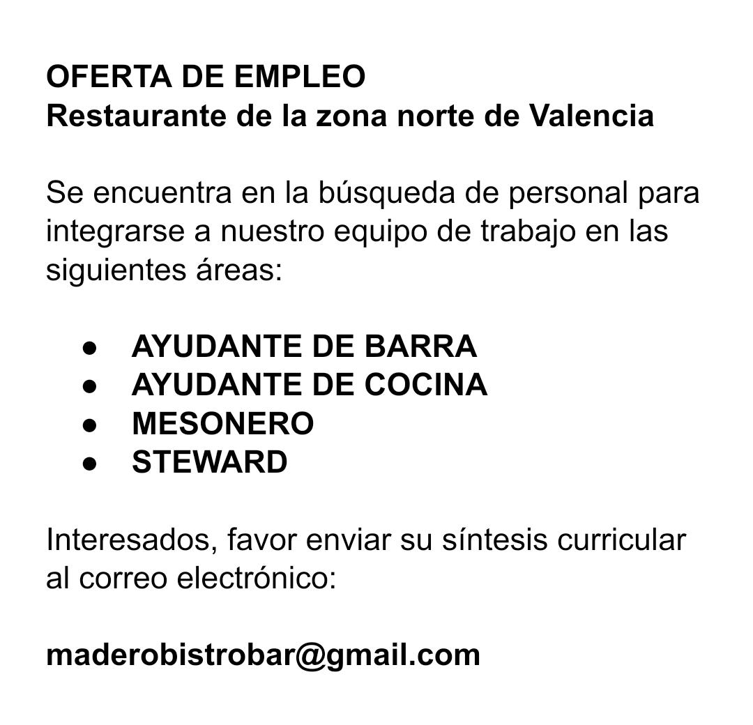 OFERTA DE EMPLEO VALENCIA ¡ÚNETE A NUESTRO EQUIPO! La Casa de la Barquilla está en la búsqueda de talento para formar parte de su equipo de trabajo. Vacantes Disponibles: Asistente administrativo. Asesores de ventas al mayor. Chofer. Operadores integrales de producción. Operador integral de almacén e inventario. Operador integral de finca. ¿Cómo postularse? Si cumples con el perfil y deseas formar parte de nuestra empresa, envía tu síntesis curricular actualizada al siguiente correo electrónico: barquilla.rrhh2026@gmail.com