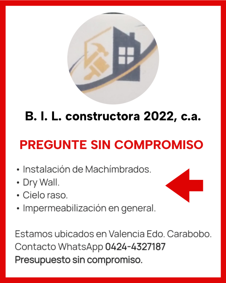 B.I.L. CONSTRUCTORA 2022, C.A. Instalación de Machímbrados. Dry Wall. Cielo raso. Impermeabilización en general. Estamos ubicados en Valencia Edo. Carabobo. Contacto WhatsApp 0424-432.71.87. Presupuesto sin compromiso