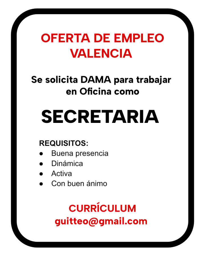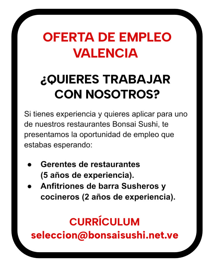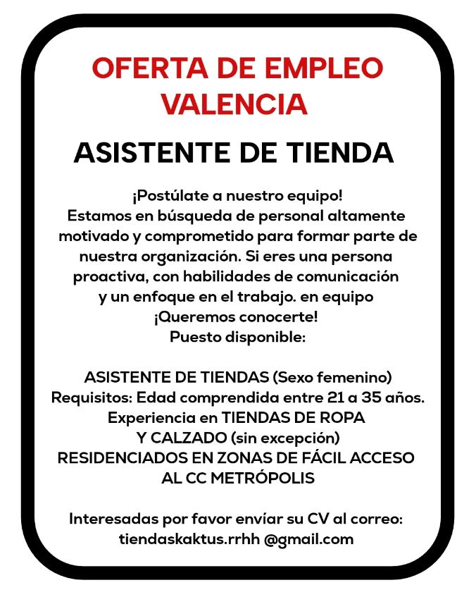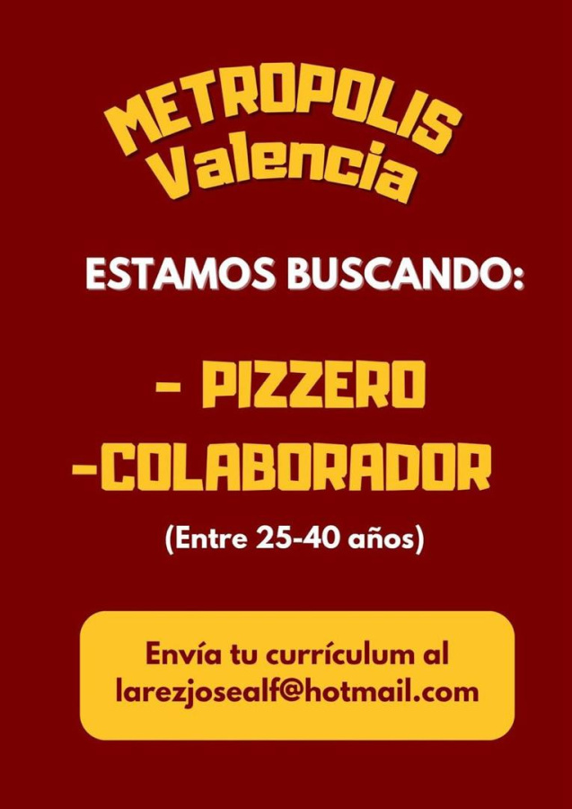 OFERTA DE EMPLEOS. METRÓPOLIS VALENCIA. ESTAMOS BUSCANDO: PIZZERO. COLABORADOR. (Edad comprendida entre 25-40 años) Envía tu currículum al correo: larezjosealf@hotmail.com