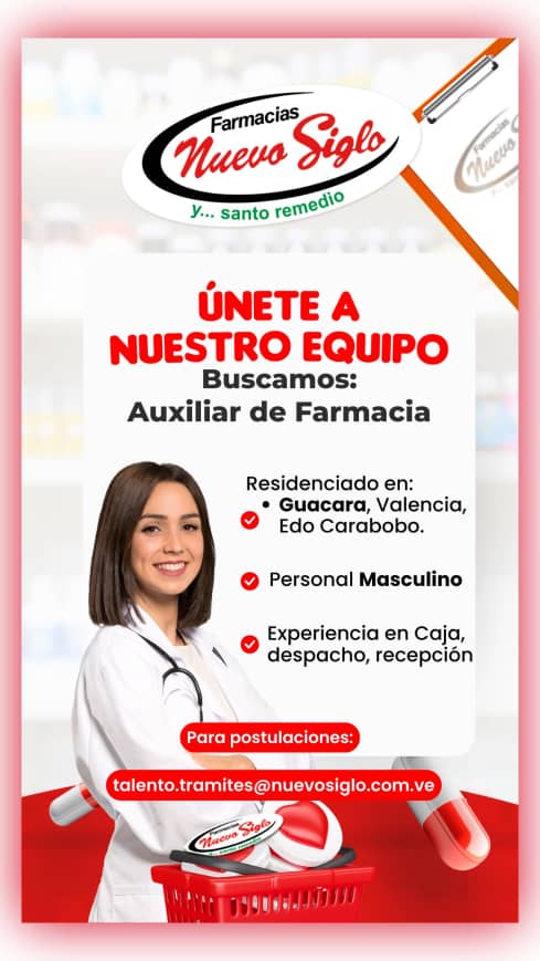 OFERTA DE EMPLEO. VALENCIA. ÚNETE A NUESTRO EQUIPO. Buscamos: AUXILIAR DE FARMACIA. Residenciado en: Valencia, Edo. Carabobo (zonas cercanas al Hospital). Experiencia en caja, despacho, recepción. Disponibilidad inmediata. Para postulaciones: talento.tramites@nuevosiglo.com.ve