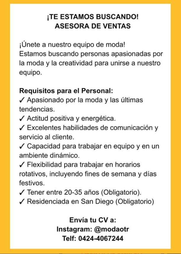 OFERTA DE EMPLEO. SAN DIEGO. Solicito personal FEMENINO para trabajar en Spa/Estética. Lashista (cejas y pestañas) Pigmentación de cejas y colocación de pestañas. Que sepa trabajar con máquina de Hidrogacial. Que sepa trabajar con IPL y con Láser Alondra (no limitativo) Que viva en el área de San Diego (preferiblemente) Interesados comunicarse al 0424-400.14.41.