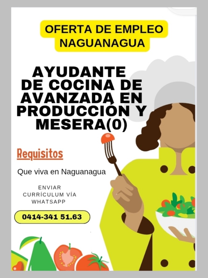 OFERTA DE EMPLEO. NAGUANAGUA. Solicitamos AYUDANTE de COCINA de avanzada en producción y MESERA(O) Que viva en Naguanagua. Enviar currículo al WHATSAPP 0414-341.51.63.