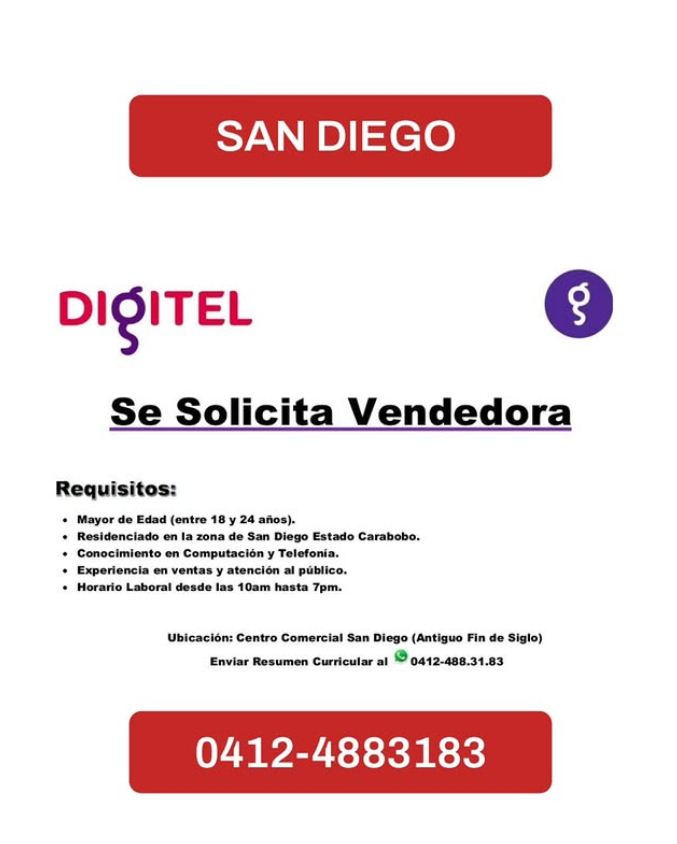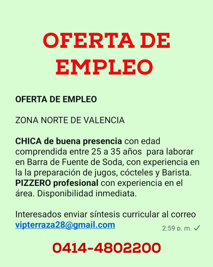 OFERTA DE EMPLEO. SAN DIEGO CARABOBO. Envíe currículum al WhatsApp 0412-488.31.83.