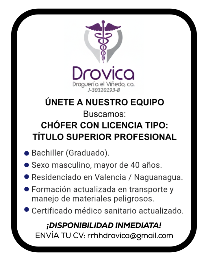 OFERTA DE EMPLEO. VALENCIA. Nos encontramos en la búsqueda de: CHOFER DE TRANSPORTE CARGA PESADA. Licencia de 5ta. El aspirante al cargo debe cumplir con los siguientes requisitos: Edad: Mayor de 40 años. Con residencia en Carabobo. Poseer vehículo propio. Documentación de conducir VIGENTE. Certificado Médico Sanitario VIGENTE (Emitido por INSALUD) TÍTULO SUPERIOR PROFESIONAL DEL INTT. Curso de Manejo de Materiales Peligrosos Actualizado. Experiencia comprobable (limitativo) De cumplir todos los requisitos postularse al correo: postulaciones.drog@gmail.com Debe Indicar qué tipos de transporte ha conducido.