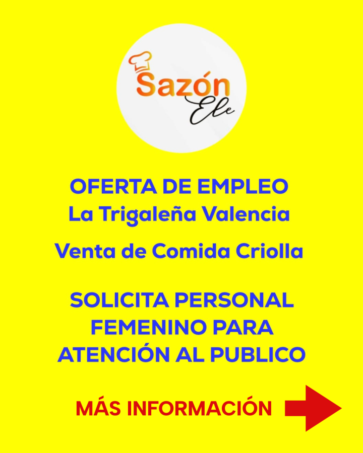 OFERTA DE EMPLEO. VALENCIA. Solicito MUCHACHAS para atención al cliente, en venta de comida criolla. Edad comprendida entre 22 y 30 años. Vendemos sopas, cachapas, cochino frito, parrilla, etc. Trabajamos todos los días, libra un día a la semana, de lunes a jueves, cualquier día de esos, no se libra ni viernes, ni sábado, mucho menos domingo, ya que son los días más movidos y es un fin de semana, se trabaja con volumen de cliente, solo damos desayuno, al llegar deben limpiar, organizar el área, se colabora en todo, el uso del teléfono es restringido. Pagamos 50$ semanal y adicional propina. Estamos ubicados en la urbanización TRIGAL SUR, a media cuadra del Club Chino, “Sazónele” Pregunta por Elena o Rodolfo. Horario de 7.30 am a 4.30 pm de lunes a viernes y los sábados y domingos 5.30 pm. Muy importante, los pagos son en Bs a la tasa del BCV. Sólo personal femenino. Valencia Trigal, a media cuadra del Club Chino. Interesados comunicarse al 0424-452.50.81.