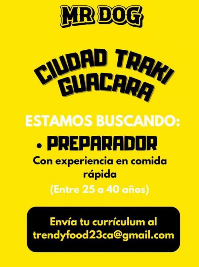 OFERTA DE EMPLEO. GUACARA EDO. CARABOBO. Interesados enviar CV al correo: trendyfood23ca@gmail.com