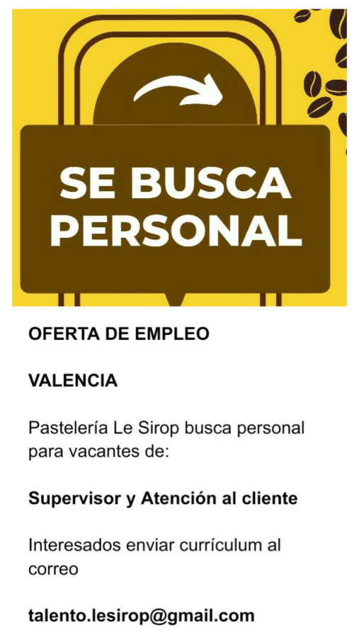 OFERTA DE EMPLEO. VALENCIA. Pastelería Le Sirop busca personal para vacantes de: Supervisor y Atención al cliente. Interesados enviar currículum al correo: talento.lesirop@gmail.com