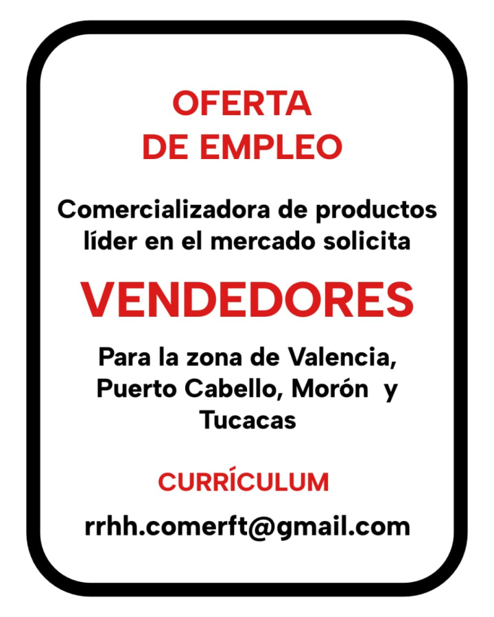 OFERTA DE EMPLEO. Comercializadora de productos líder en el mercado solicita VENDEDORES para la zona de Valencia, Puerto Cabello, Morón y Tucacas. Interesados enviar síntesis a: rrhh.comerft@gmail.com