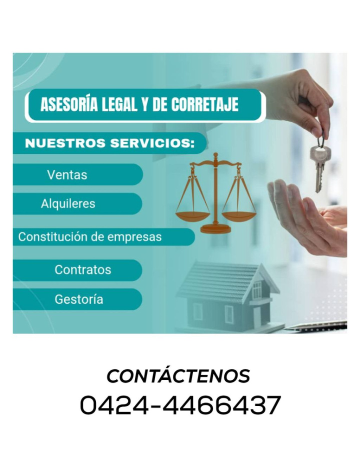 43 años en el Ejercicio te Ofrece ASESORÍA JURÍDICA a Personas Naturales y Jurídicas, Inmobiliarias aclarando dudas e igualmente explicación al Cliente con respecto a Negocios por concretar. Igualmente redacción de documentos Constitutivos, Actas de Asamblea, Venta de Acciones, Orientación para tener al día los Estados financieros para el Registro. Asesoría Laboral para Trabajadores y Empresas, trámites extrajudiciales y administrativos. Redacción de todo tipo de Documentos: Compra Venta de muebles e inmuebles, Hipotecas, Orientación. Protección de Niños, Niñas y Adolescentes, Permisos para Viajar, Curatela, asesoría en relación a esta materia (ex Defensora del Municipio Valencia). Divorcios, incluso por Desafecto. En materia Inquilinaria: le ayudo con esos problemas que se presentan en Ocasión a los Arrendamientos. En fin cualquier trámite Legal ante Organismos Públicos y Privados. Consultas acorde a la situación del momento. Teléfono en línea, Online, Video llamadas y Presencial: Previa Cita. Información 04244149704 WhatsApp: +58-04244149704